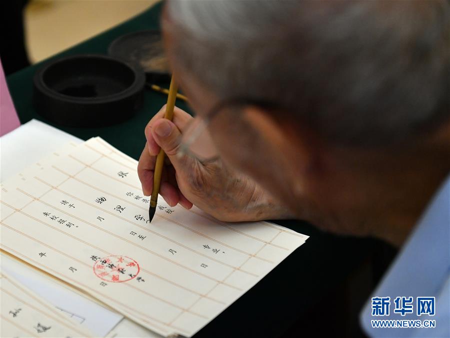8月13日,陜西師范大學(xué)退休教師符有堂書寫錄取通知書。 當(dāng)日,陜西師范大學(xué)2020年手寫錄取通知書正式開筆。該校自2007年起采用毛筆書寫錄取通知書的方式,為新生傳遞佳音。今年,學(xué)校十余位退休教師、在職教師、校友代表等書法愛好者將為約4500名新錄取的本科生送上帶著墨香的大學(xué)錄取通知書。 新華社記者 張博文 攝
